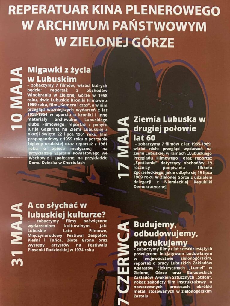 Będą to filmy z lat 50′ i 60′, które opowiadają o życiu w Lubuskiem. Serdecznie zapraszam dawnych mieszkańców Zielonej Góry, którzy być może zobaczą siebie w różnych sytuacjach, a także młodzież ciekawą, jak ta Zielona Góra i okolice wyglądały, jak żyli mieszkańcy. Wstęp jest wolny. Startujemy przed budynkiem archiwum o 18:30.Beata Grelewicz, Archiwum Państwowe w Zielonej Górze
