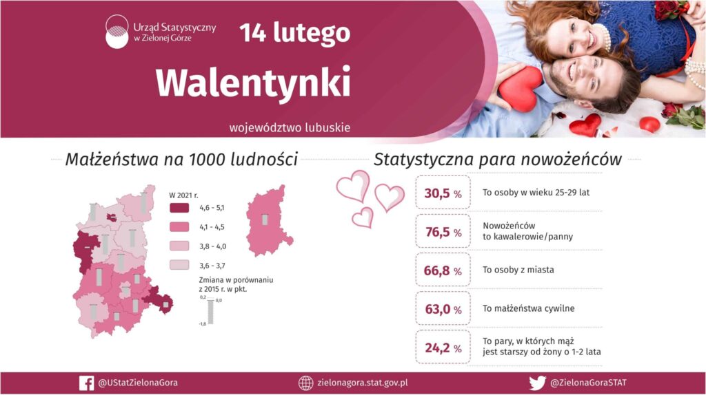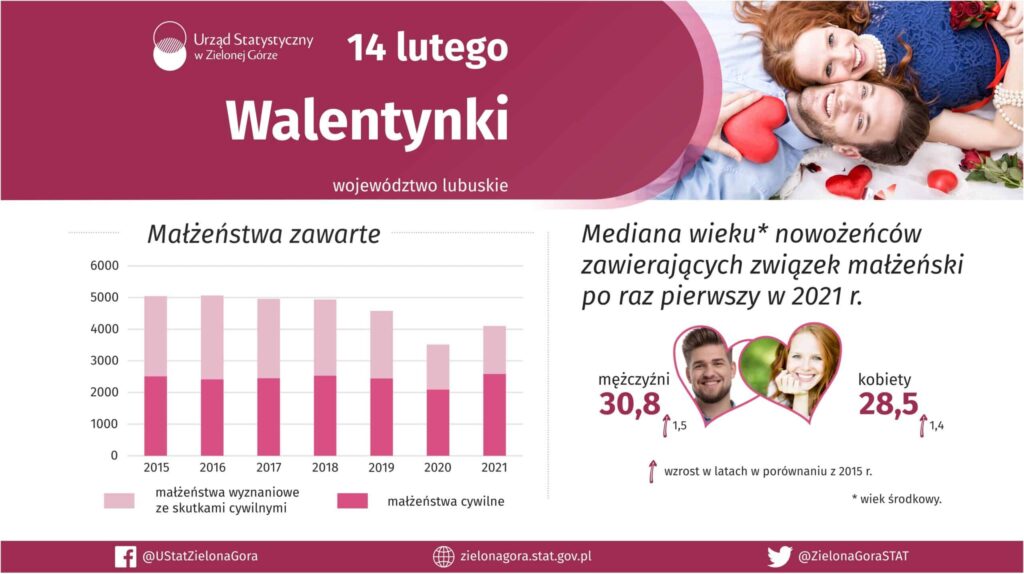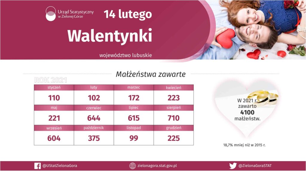 W oczekiwaniu na naszą radiową, walentynkową zabawę popatrzcie na grafiki przygotowane przez Urząd Statystyczny w Zielonej Górze. Dane dotyczą m.in. liczby małżeństw zawartych w województwie lubuskim w 2021 roku.