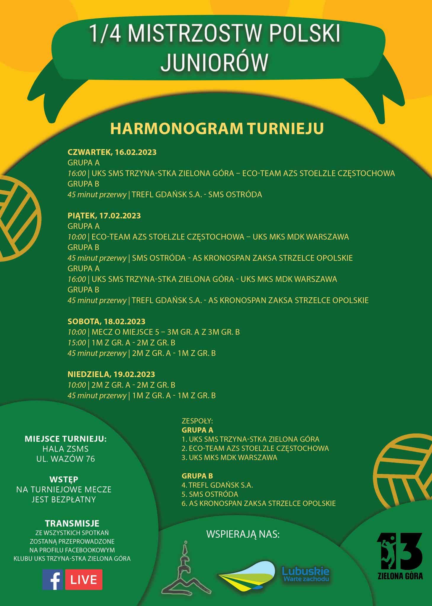 W czwartek w Zielonej Górze rozpoczyna się ćwierćfinałowy turniej Mistrzostw Polski Juniorów w siatkówce. UKS Trzynastka – gospodarz turnieju trafił do grupy A, z mocnymi drużynami z Częstochowy i Warszawy.