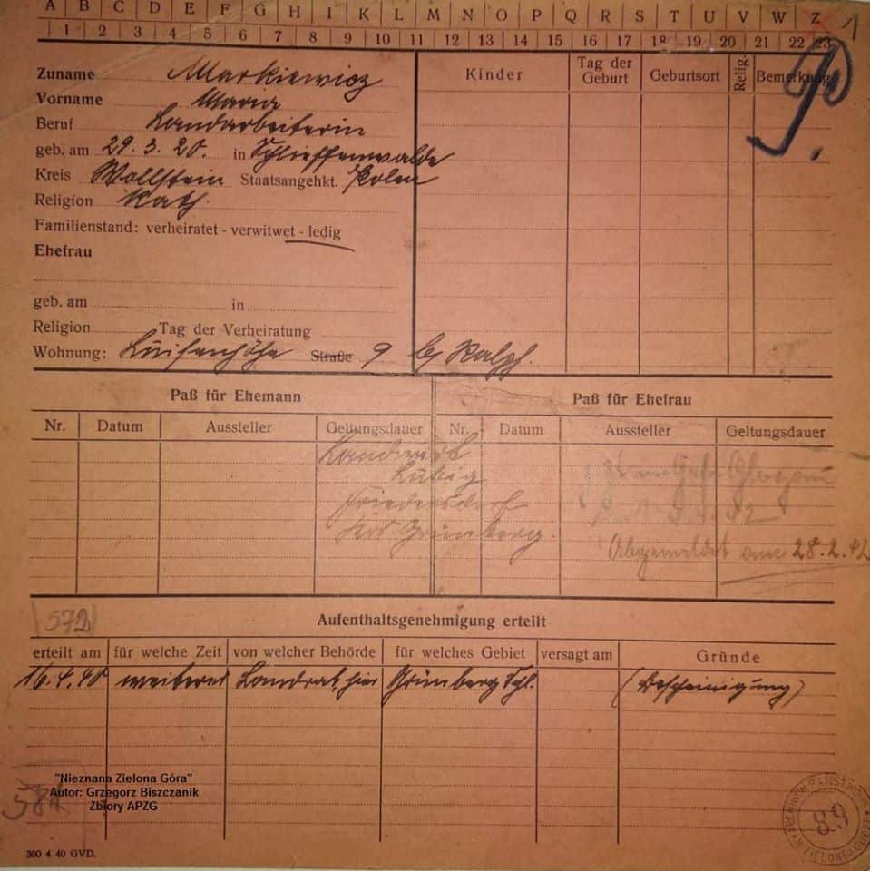 W zielonogórskim archiwum zachowała się karta ewidencyjna Marii Markiewicz, nie posiada jednak zdjęcia, więc nie było możliwości ustalenia jak wyglądała. Analizując zapisy jej dokumentacji obozowej wynika, że zakończyła pracę w fermie drobiu w kwietniu 1942 r., a następnie została przetransportowana do Głogowa. Tam ślad się urywa… Niestety pomimo usilnych starań nie udało mi się ustalić czy przeżyła wojnę. Być może uda mi się kiedyś ustalić jej dalszy los, a nawet jej wspomnienia z ówczesnej Zielonej Góry. Mogą mi w tym pomóc Wasze udostępnienia.