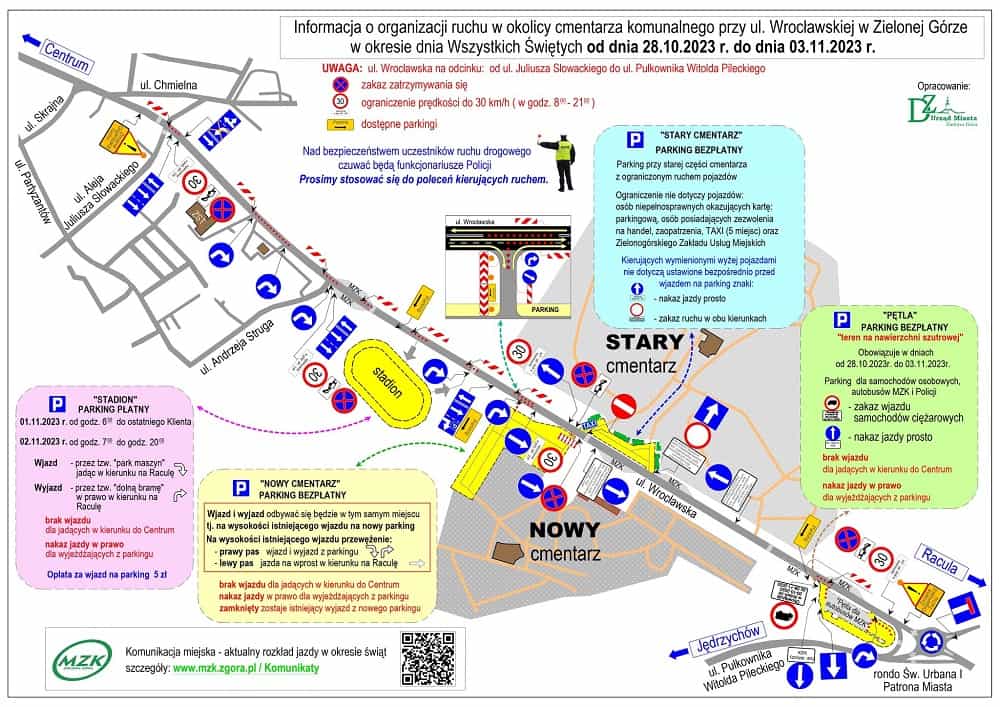 Urząd miasta zmienił na czas od 28 października do 3 listopada organizację ruchu przy cmentarzu na ul. Wrocławskiej. Dostępne będą trzy bezpłatne parkingi dla samochodów osobowych – przy nowym i starym cmentarzu oraz na pętli autobusowej, a także płatny parking na stadionie żużlowym.