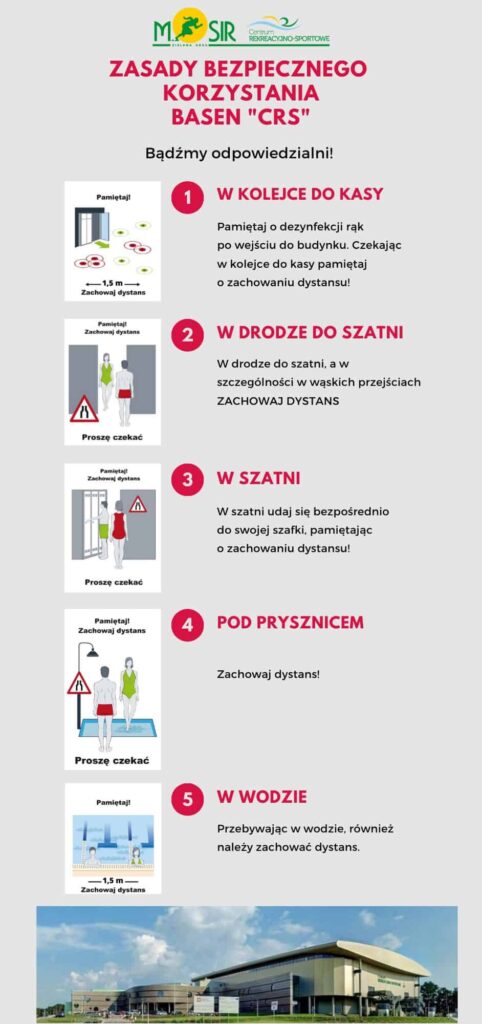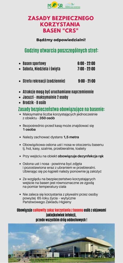 Już jutro otwiera się natomiast basen. Tory sportowe będą czynne od 6:00 do 22:00, zaś przestrzeń rekreacyjna od 9:00 do 21:00. Na obiekt będzie można wejść z zachowaniem tzw. reżimu sanitarnego. Szczegółowe wytyczne znajdziecie poniżej.