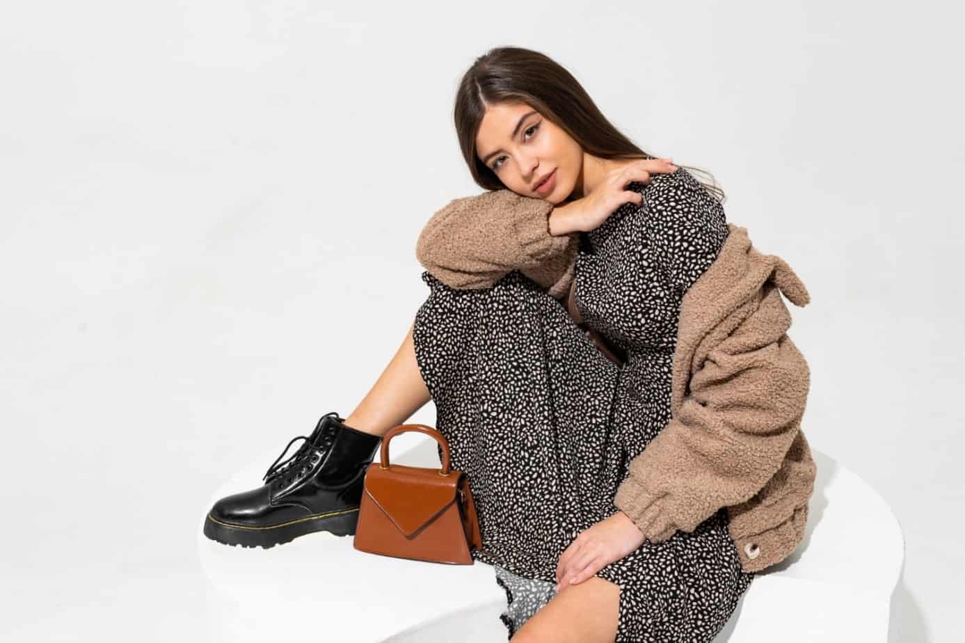 Buty z ćwiekami i klamrami sprawdzą się również w nieco bardziej kobiecych outfitach. Jak je stylizować? Nasza pierwsza propozycja to dzianinowa, krótka sukienka oversize. W pasie koniecznie przewiąż paskiem, aby uwydatnić talię. Na głowę włóż kaszkiet, a na ramię elegancką kopertówkę na złotym łańcuszku. Postaw na buty w jasnych kolorach np. odcieniach beżu. Do tego zwiewna sukienka. Na siebie zarzuć kultową ramoneskę. Całość uzupełnij modną listonoszką.