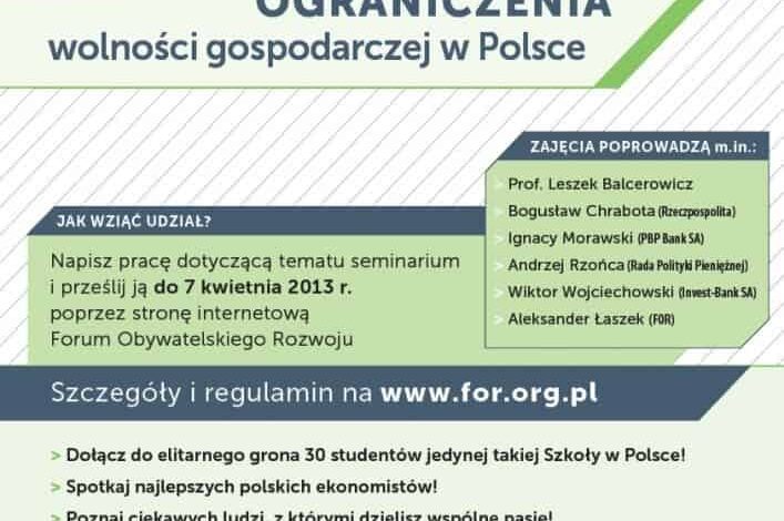 Do Wiosennej Szkoły Leszka Balcerowicza mogą aplikować studenci wszystkich lat i kierunków studiów, tegoroczni absolwentów oraz doktoranci (do 32 roku życia), którzy interesują się sprawami polskiej i światowej gospodarki. Aby wziąć udział w szkoleniu, należy napisać pracę konkursową pt. „Ograniczenia wolności gospodarczej w Polsce” . Forma pracy to artykuł prasowy o objętości do 5 tys. znaków ze spacjami. Termin przesyłania prac mija 7 kwietnia. Formularz zgłoszeniowy dostępny jest na stronie www.for.org.pl.