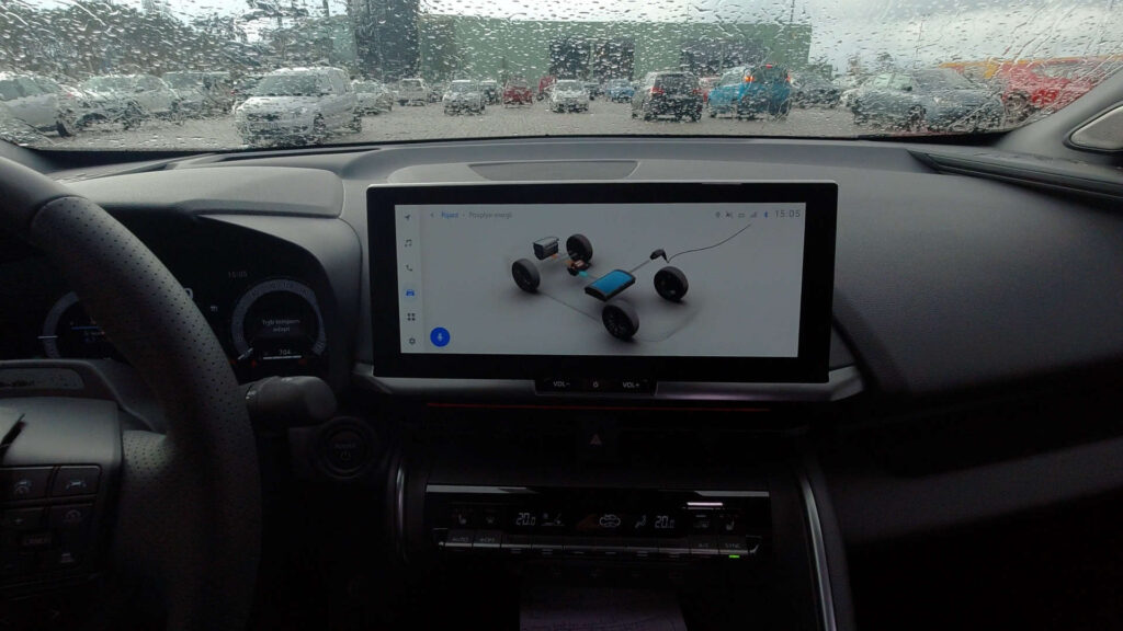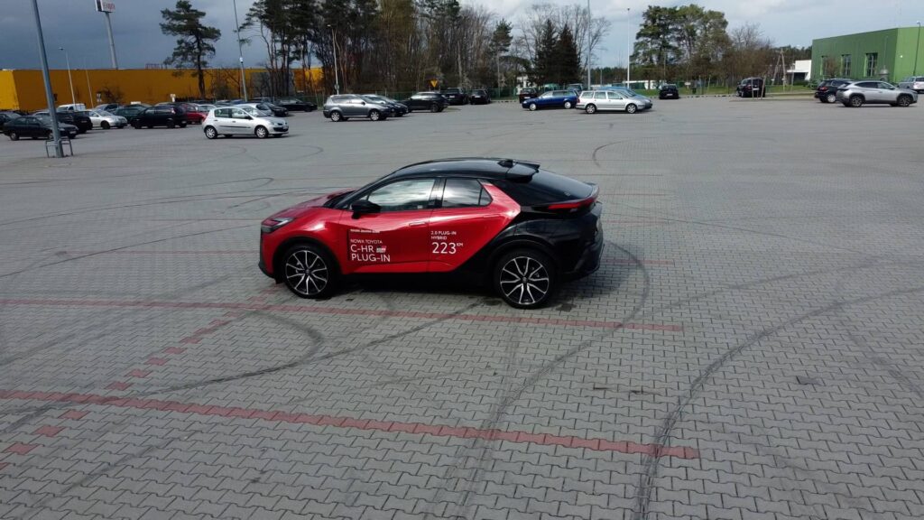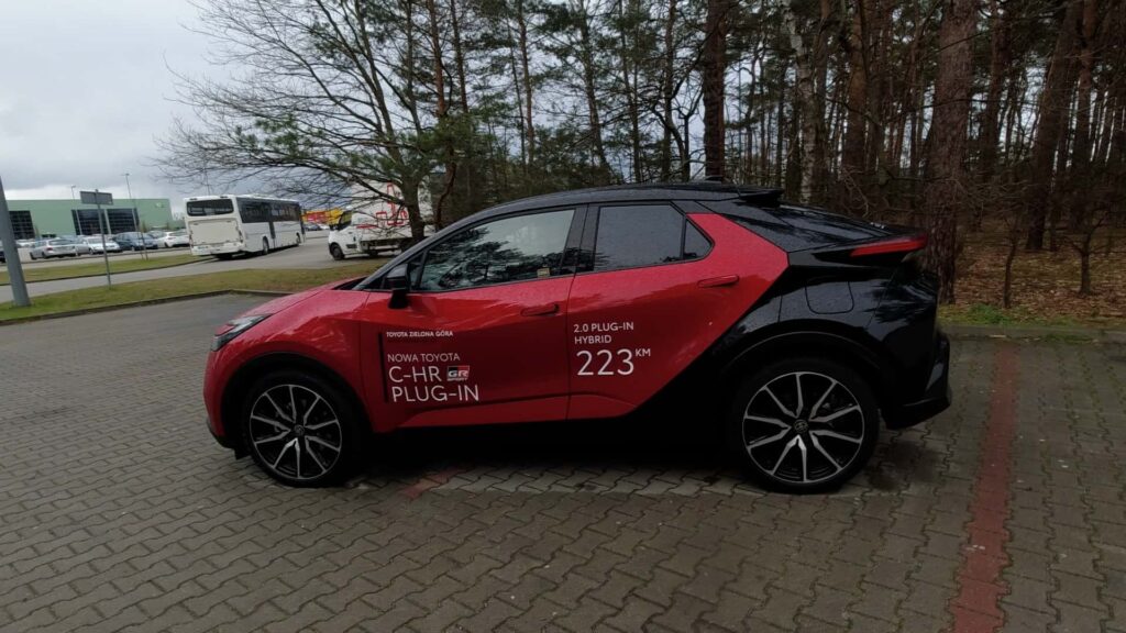 Zacznijmy od zewnętrznego wyglądu. Sylwetką nawiązuje do poprzednika, choć rysy auta są bardziej agresywne z większą domieszką sportowego charakteru. Zmienił się przedni pas gdzie światła i wygląd maski zostały zapożyczone z Toyoty Prius czy większego brata elektrycznej bz4x. Z boku w oczy rzuca się poprawiona linia bocznych szyb gdzie pojawia się bardziej tradycyjny wygląd. Przeprojektowano klamki, które teraz wyskakują z karoserii, są w jednej linii. Projektanci wsłuchali się w głosy użytkowników. Pozbyto się klamek umieszczonych w tylnej górnej części drzwi. Tylna klapa jest wręcz identyczna jak w pierwszym C-Hrze, choć listwa świateł jest teraz w jednej linii. Uwagę przykuwa świetlny znak informującym, z jakim modelem mamy do czynienia. Na tylnej szybie zabrakło wycieraczki, ale spokojnie nie jest to zabieg związany z oszczędnościami. Kąt nachylenia został tak ustawiony, aby w trakcie jazdy woda swobodnie spływała po szybie bez konieczności używania wycieraczki. Model, który dla was testowaliśmy, to wersja GR Sport Premier Edition osadzona na 20 calowych kołach.