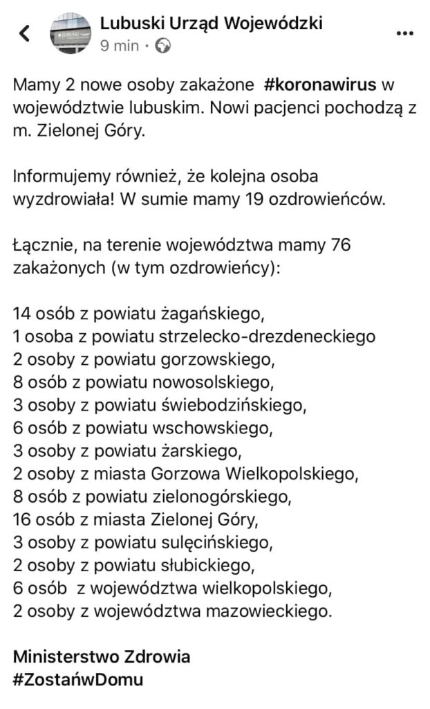 Ponadto u kolejnej osoby ustąpiły objawy zakażenia. Łącznie w regionie wyzdrowiało 19 pacjentów.