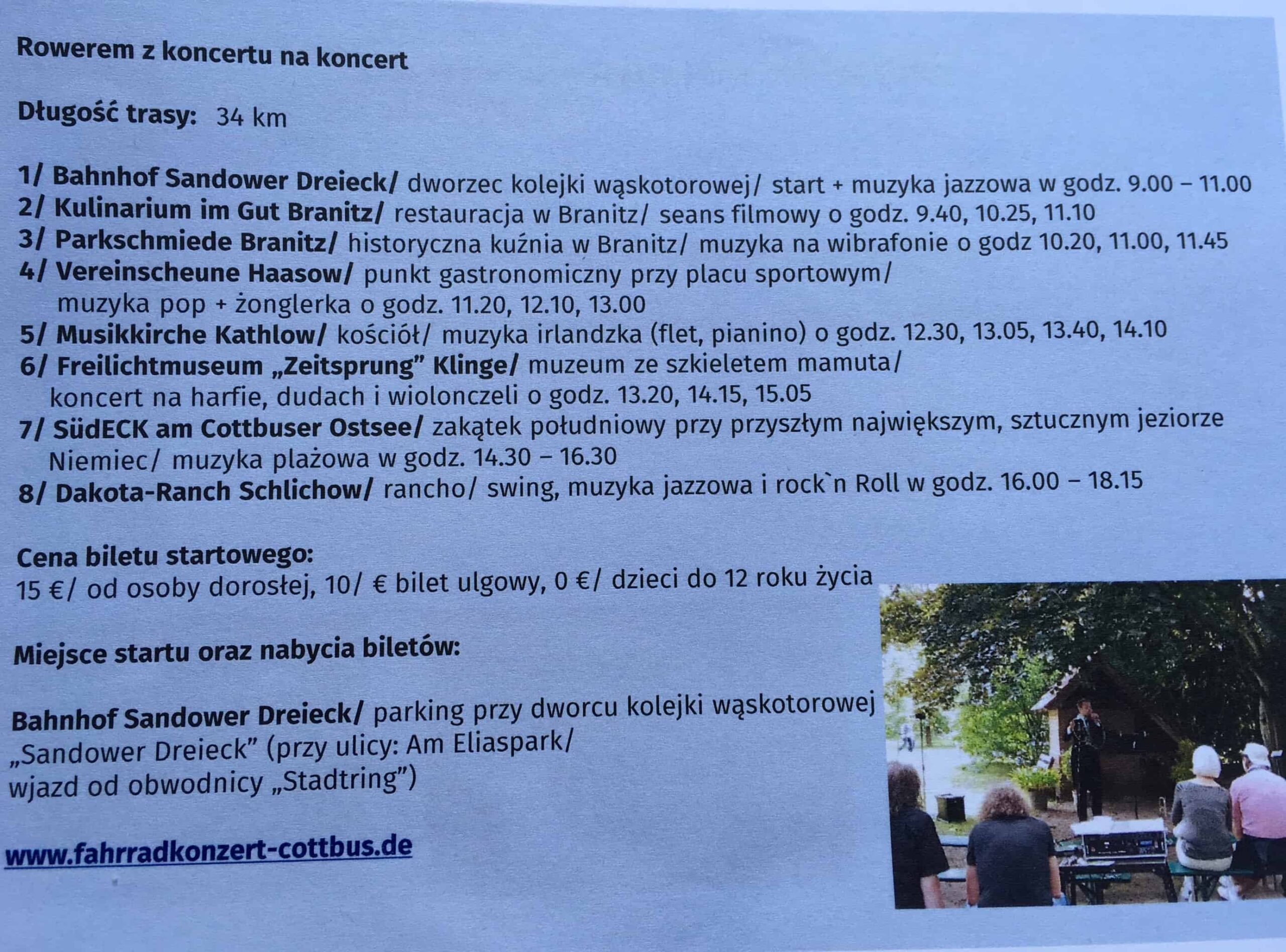 Podczas tej wycieczki rowerem turyści mają wysłuchania różnych, małych koncertów w pięknych miejscach. W tym roku mamy przygotowanych osiem przystanków, w których odbędą się koncertów. Rozpoczynamy przy dworcu kolejki wąskotorowej w Cottbus, a całość kończymy na ranczu w miejscowości Schlichow, gdzie mamy muzykę jazzową, rock and rolla.Jolanta Imbierska, koordynator polsko-niemieckiego Centrum Promocji i Informacji Turystycznej w Cottbus