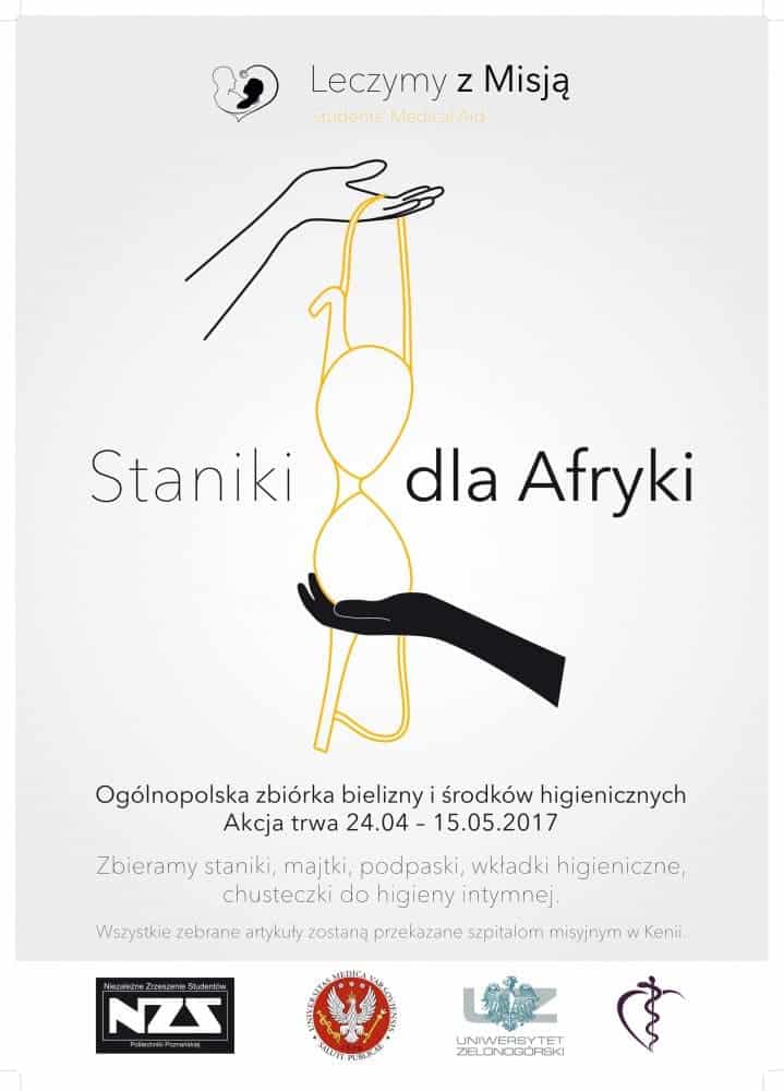 Studenci Wydziału Lekarskiego i Nauk o Zdrowiu włączyli się do akcji „Staniki dla Afryki”, która jest częścią programu „Leczymy z Misją”. Dlatego też na Uniwersytecie Zielonogórskim przeprowadzona zostanie zbiórka bielizny oraz artykułów higienicznych. Potrzebne przedmioty to przede wszystkim: staniki, majtki, wkładki higieniczne, podpaski, czy też chusteczki do higieny intymnej.