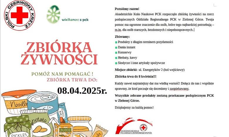 Wszystkie produkty można zostawiać w holu budynku A-22 przy ul. Energetyków 2. Zbiórka potrwa do 8 kwietnia. Zebrane produkty trafią do podopiecznych zielonogórskiego oddziału PCK.