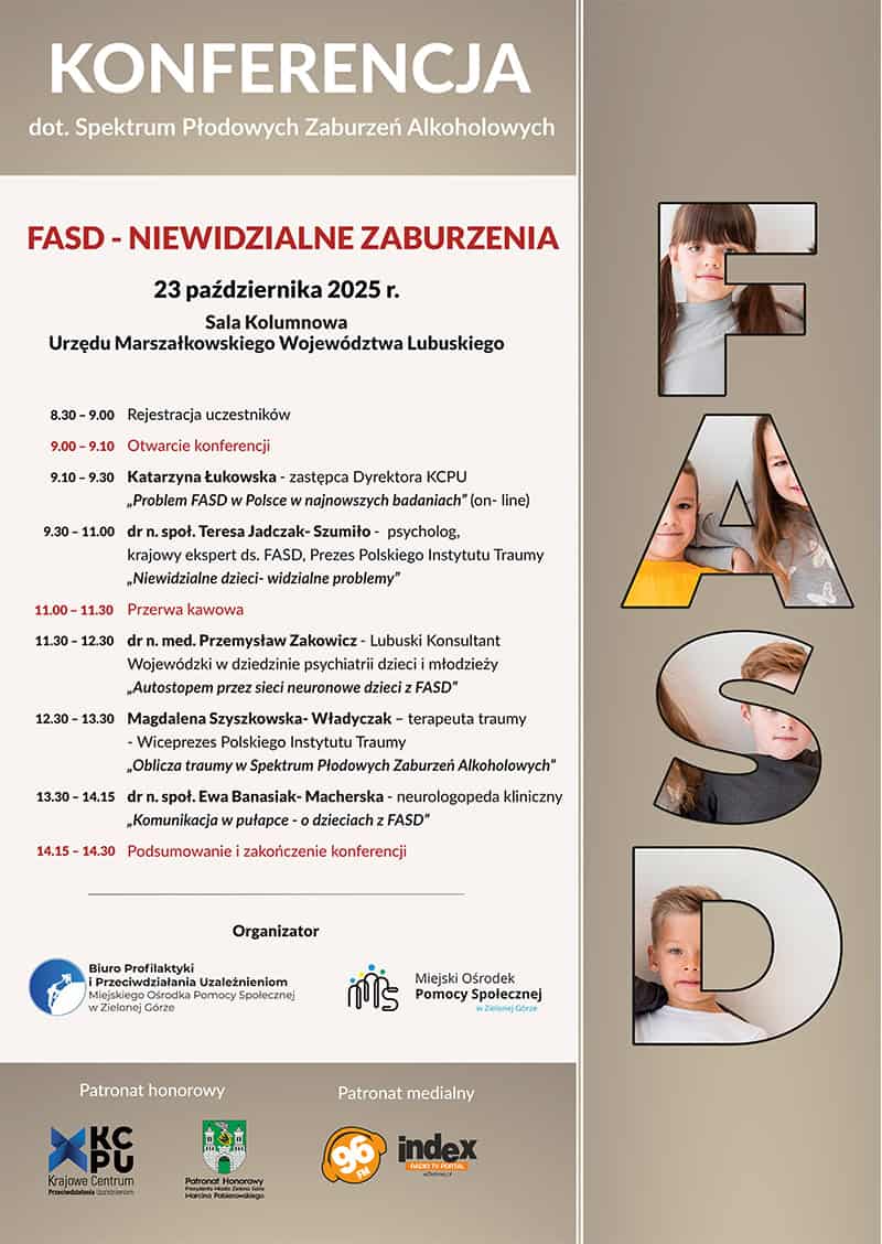 Zapraszamy na konferencję „FASD – niewidzialne zaburzenia”. Wydarzenie skierowane jest do psychologów, lekarzy, psychoterapeutów, pedagogów, pracowników naukowych, logopedów, pracowników socjalnych, kuratorów, rodzin zastępczych oraz wszystkich osób, które w swojej pracy spotykają się z problemem FASD.