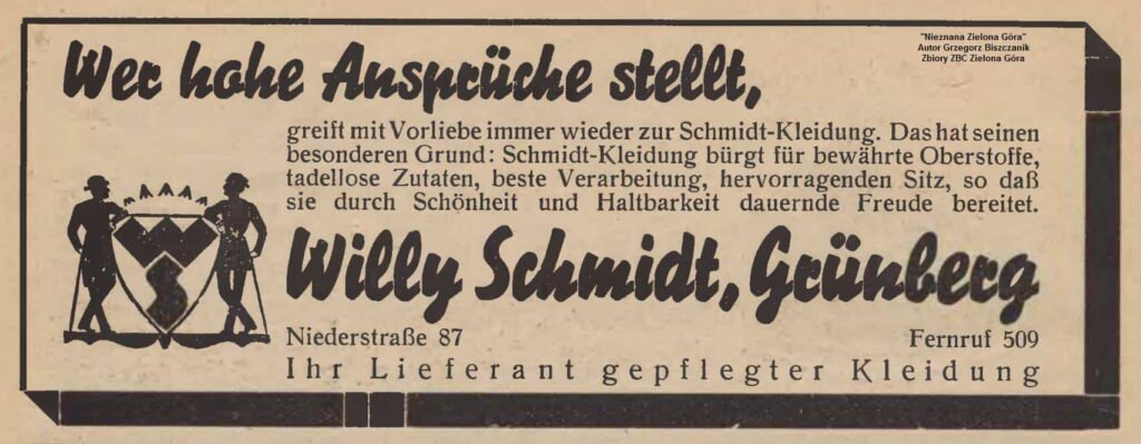 Willy Schmidt reklamował swój dom handlowy jako ten dla których „patrzą wysoko” oferując wysokiej jakości materiały, tkaniny. Na miejscu można było zaprojektować i wykonać swój garnitur oraz koszule! Każdy zakupiony towar otrzymywało się z firmowym wieszakiem. Schmidt bardzo mocno konkurował z domem handlowym Graua i miał filię swojego sklepu przy dzisiejszej ul. Sobieskiego.