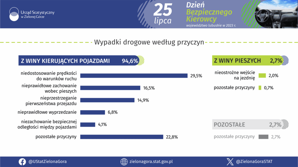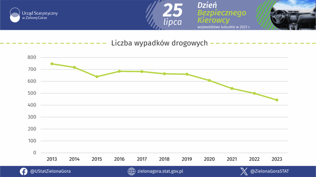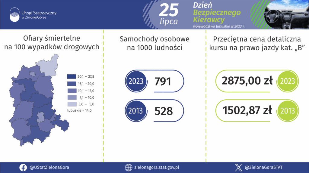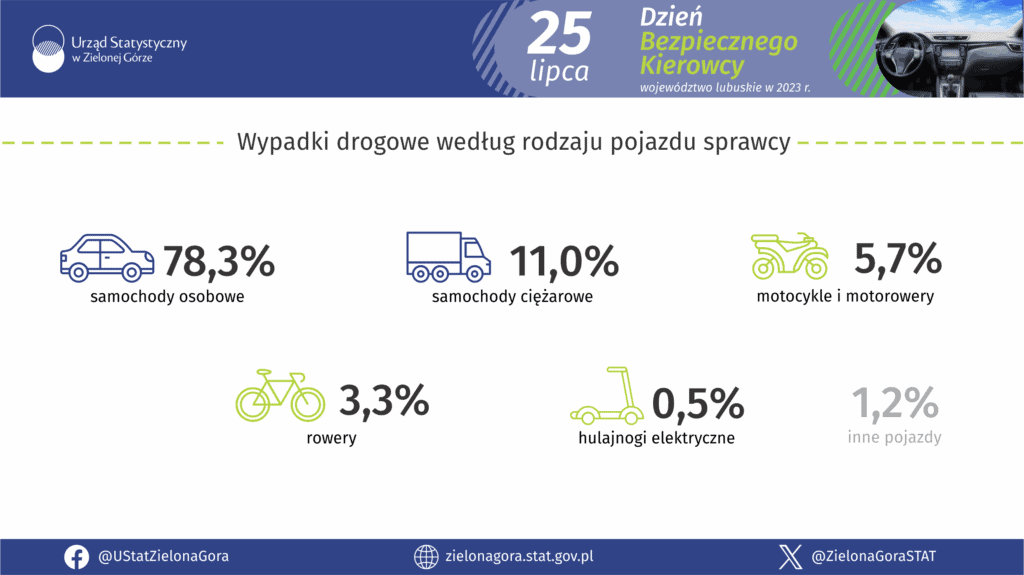 25 lipca obchodzimy Święto Bezpiecznego Kierowcy. Z tej okazji Urząd Statystyczny w Zielonej Górze przygotował infografiki dotyczące bezpieczeństwa na drogach w województwie lubuskim – na podstawie danych z 2023 roku.