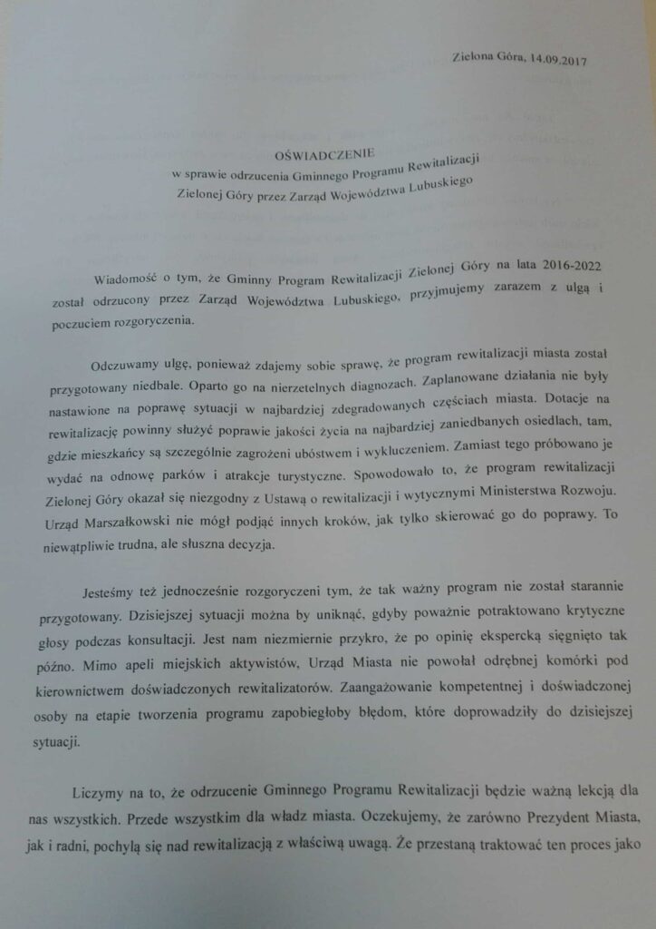 My, aktywiści miejscy już rok temu sygnalizowaliśmy, że proces ten nie może być realizowany na szybko. Im wolniej miasto robi taki proces, przeprowadza diagnozy, tym większą można mieć pewność, że te diagnozy będą dobrze zrobione. Dzisiaj, po roku, okazuje się, że jednak mieliśmy rację, że nasze prośby nie zostały wysłuchane. Przez to właściwie tracimy wszyscy. Nie chcemy, żeby szedł też w miasto przekaz, że jest to jakąś polityczną zagrywką. Musimy zrozumieć, że mamy źle przygotowany program rewitalizacji, który teraz należy poprawić.Joanna Liddane, Zielonogórskie Towarzystwo Upiększania Miasta