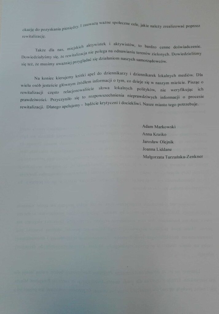 W sprawie rewitalizacji można powiedzieć, że w jakimś stopniu wszyscy zawiedliśmy. Zarówno jeśli chodzi o nas, aktywistów, jak i niestety pracę dziennikarzy. Zbyt długo pozwoliliśmy, by mieszkańcy pozostawali w przekonaniu, że inwestycje na terenach zielonych to jest rewitalizacja. Natomiast faktem jest, że osoba odpowiedzialną za przygotowanie GPR jest prezydent miasta. To na nim spoczywa główna odpowiedzialność.Małgorzata Turzańska-Zenkner