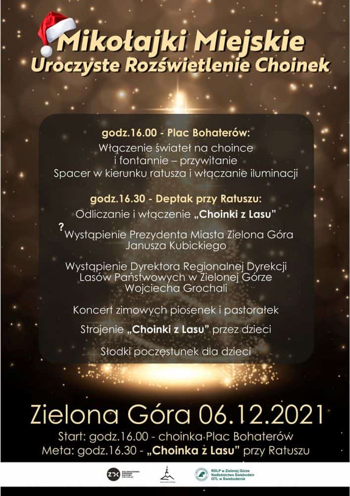 Sztuczna choinka na Placu Bohaterów już stoi. Żywa w tym roku przyjedzie z Nadleśnictwa Świebodzin. Będzie to 12-metrowy, 24-letni świerk. Włączanie świetlnych iluminacji rozpocznie się w poniedziałek o 16:00 od choinki na Placu Bohaterów, stamtąd zielonogórzanie udadzą się pod ratusz. Tam o 16:30 rozbłyśnie żywa choinka i po drodze inne świąteczne dekoracje. W planie poczęstunek dla dzieci, a także koncert kolęd i pastorałek.