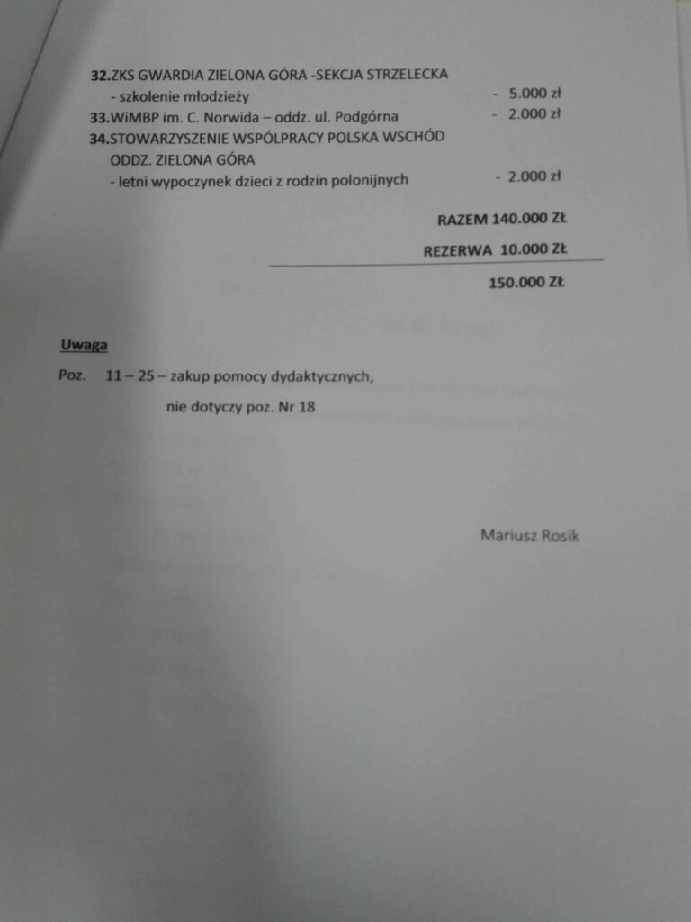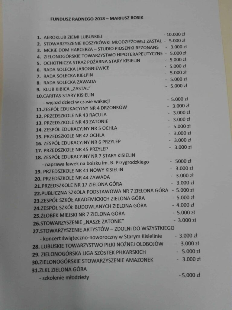 Poza tym pieniądze z puli radnych trafiają na festiwal kina FrankoFilm, do Parku Kolei Szprotawskiej, Aeroklub Ziemi Lubuskiej oraz wsparcie Ośrodka Integracji Społecznej na Zaciszu.