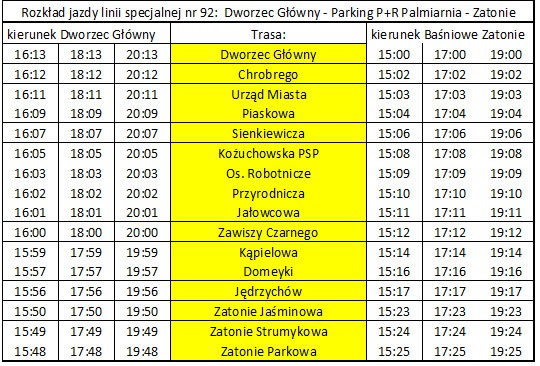 MZK informuje też, że w soboty i dni świąteczne do Zatonia jest możliwość dojazdu autobusem linii 30 z Dworca Głównego o godzinie 16:04, 18:04 i 20:14 oraz powrotu o godzinie 16:48, 18:49 i 20:51.