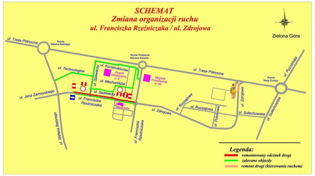 Na ulicy Rzeźniczaka ruch będzie odbywał się jednokierunkowo od ul. Batorego do nowego ronda na połączeniu z ul. Zdrojową. Czasowo zamknięty zostanie wjazd na ul. Spawaczy od strony Rzeźniczaka. Ruch wahadłowy będzie obowiązywał od Zdrojowej do Trasy Północnej. Prace mają potrwać około dwóch tygodni. Poniżej wizualizacja.