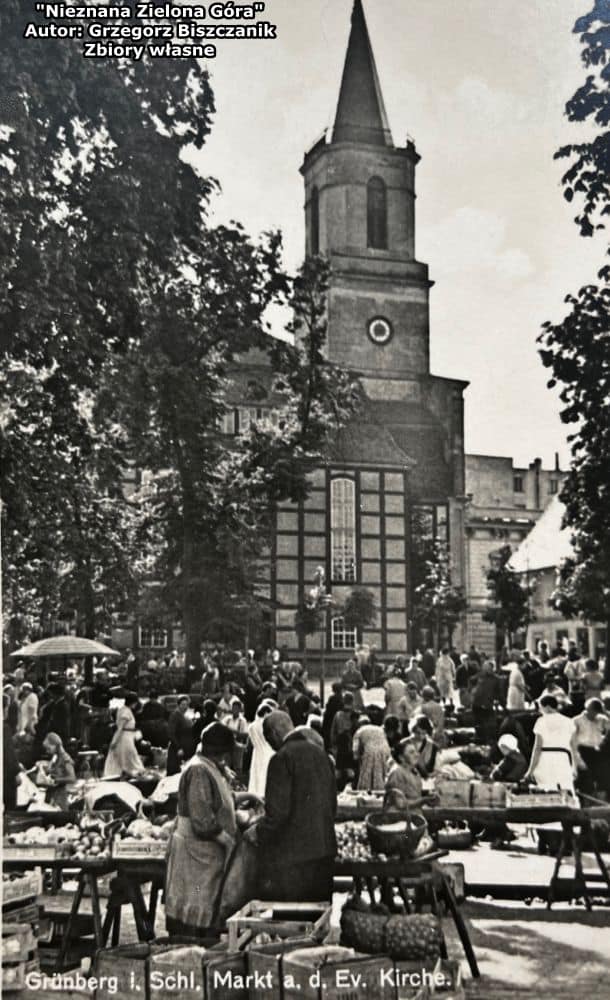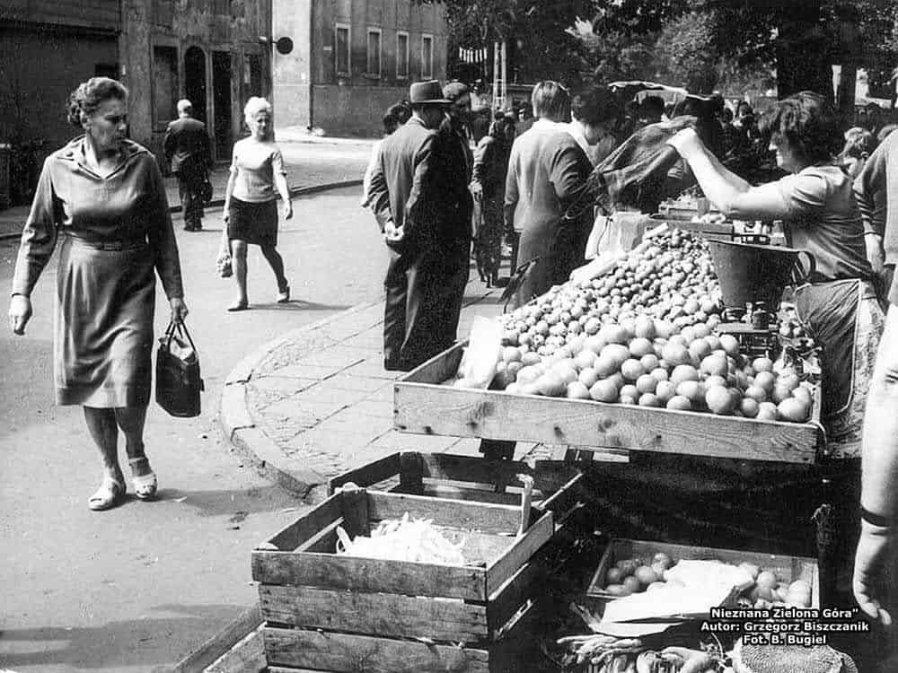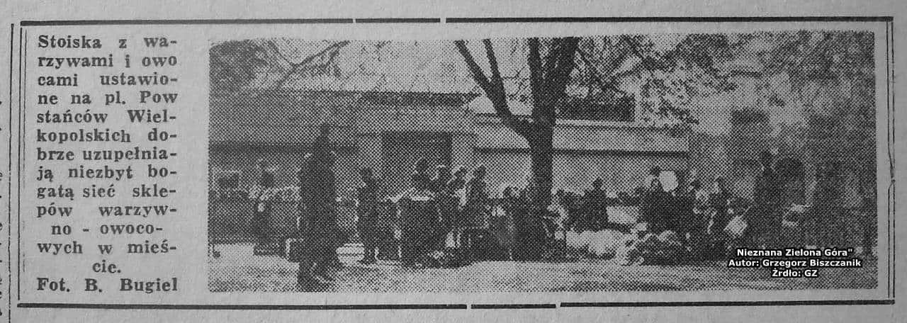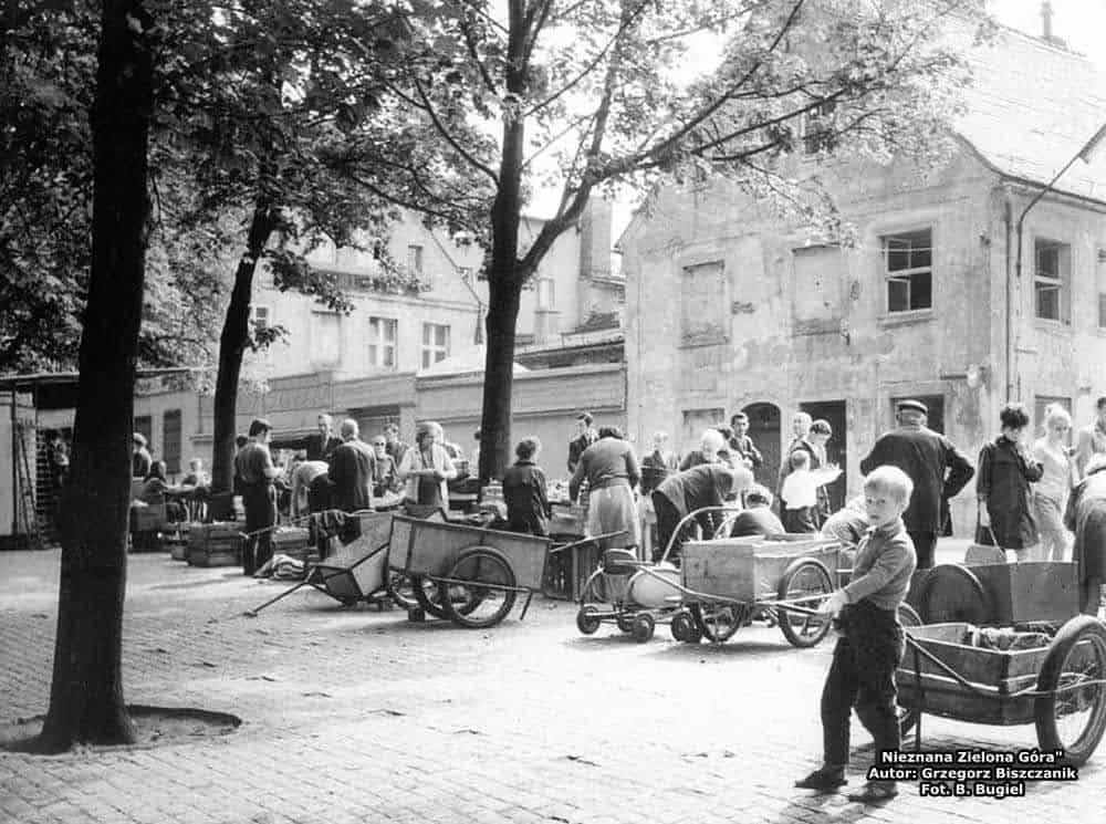 Targowisko przetrwało zawieruchę wojenną i zaraz po wojnie handel powróci w to samo miejsce. Wartym do odnotowania jest fakt, że właśnie jednym z pierwszych zarządzeń polskich władz było wyznaczenie dni targowych. Targowisko popularnie zwane “zieleniakiem” obfitowało w różnego rodzaju warzywa i owoce, które wystawiane były na specjalnych stołach i ławach. Jak pisała ówczesna “Gazeta Zielonogórska” stoiska z warzywami i owocami “dobrze uzupełniają niezbyt bogatą sieć sklepów warzywno-owocowych w mieście”. “Nic więc dziwnego, że zawsze panuje tu duży ruch”