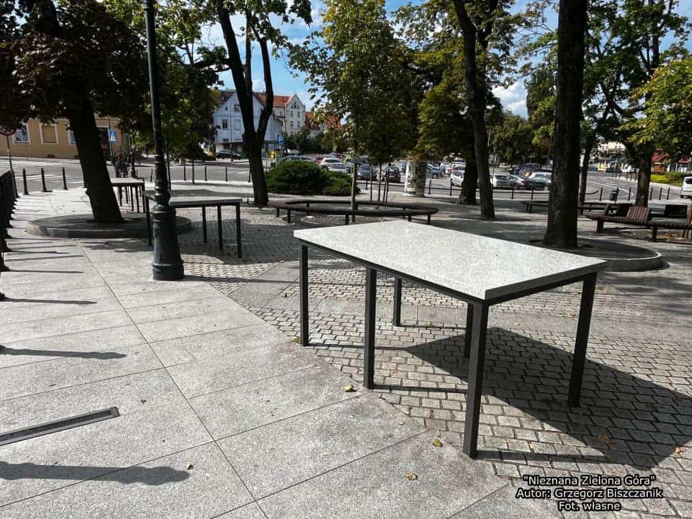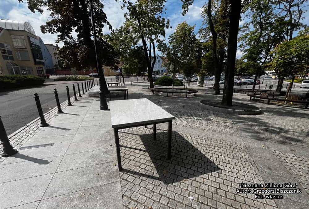 Wbrew pozorom w Zielonej Górze jest mnóstwo odniesień do historii miasta. Czasem są one bardziej oczywiste, a czasami niektóre zrozumieją tylko miejscowi. Właśnie takim odniesieniem są ów stoły, które przypominają o tym, iż właśnie w tym miejscu znajdował się… targ miejski.