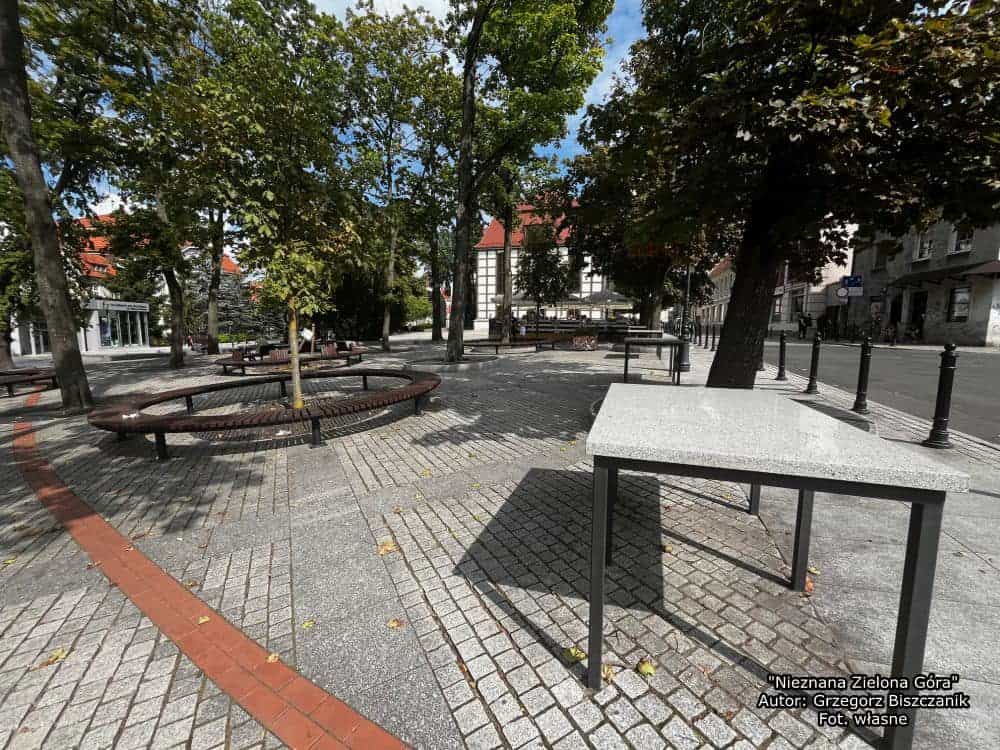 Plac Powstańców Wielkopolskich, to historyczne miejsce w Zielonej Górze. Odnowiony kilka lat temu przyciąga tłumy zielonogórzan m. in. na koncerty organizowane przez Filharmonię Zielonogórską. Jednak z jednej strony znajdują się charakterystyczne stoły. Do czego one służą i po co je tam postawiono?