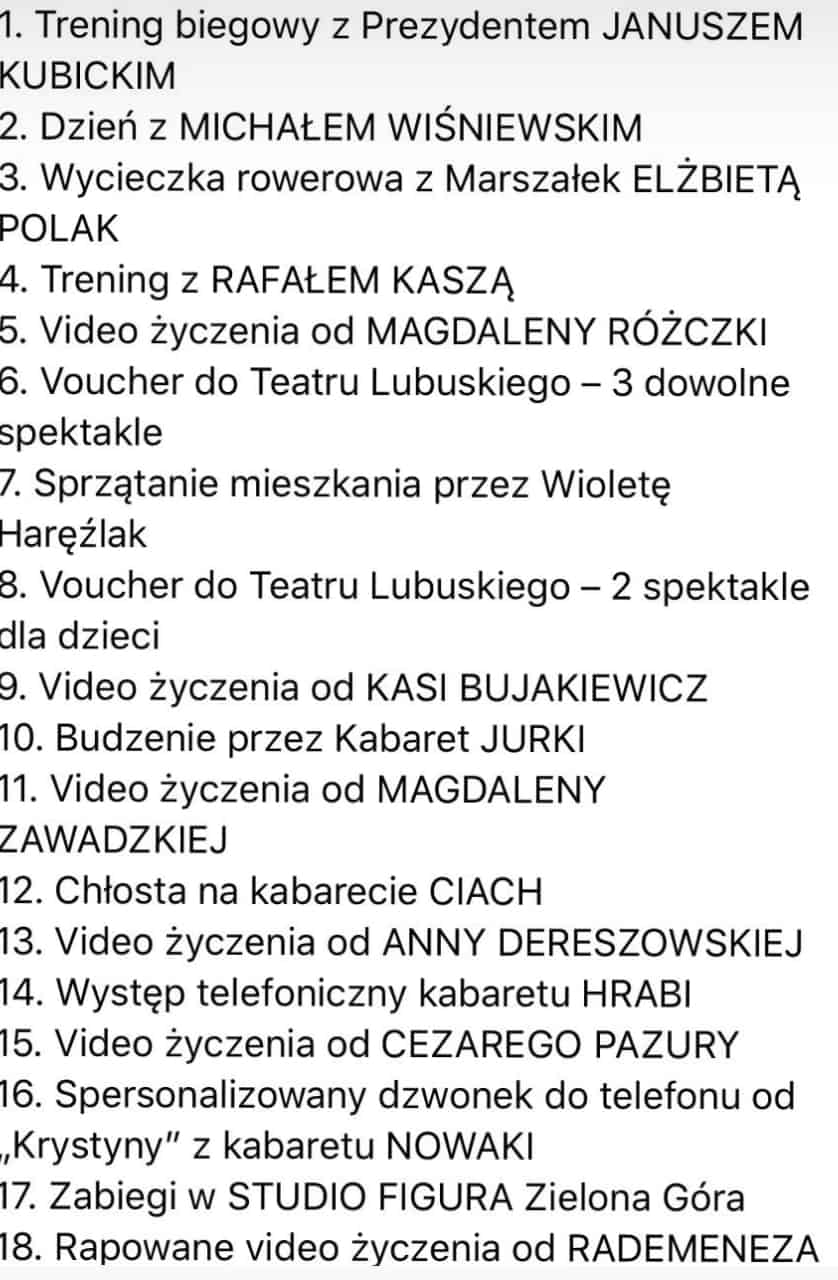 Atrakcji będzie jeszcze więcej. Swoje „usługi” oferują nie tylko artyści, ale również m.in. samorządowcy. Prezydent Janusz Kubicki wystawia na aukcję wspólny trening biegowy, a marszałek Elżbieta Polak zaprasza na wycieczkę rowerową po Parki Mużakowskim.