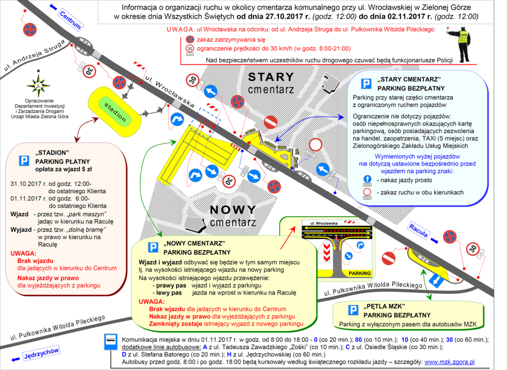 Tak jest też w Zielonej Górze. W okolicy cmentarza komunalnego przy ul. Wrocławskiej do 2 listopada obowiązuje zmieniona organizacja ruchu. Parkingi bezpłatne są przy tzw. „nowym cmentarzu”, przy czym wjazd i wyjazd odbywa się w tym samym miejscu, czyli na wysokości istniejącego wjazdu na nowy parking. Brak wjazdu dla jadących w kierunku centrum. Istniejący wyjazd z nowego parkingu został zamknięty. Ponadto bezpłatny parking jest także na pętli MZK. Parking przy tzw. „starym cmentarzu” jest z ograniczonym ruchem pojazdów. Dla samochodów jest dostępny również stadion żużlowy. Opłata za wjazd w cenie 5 zł.