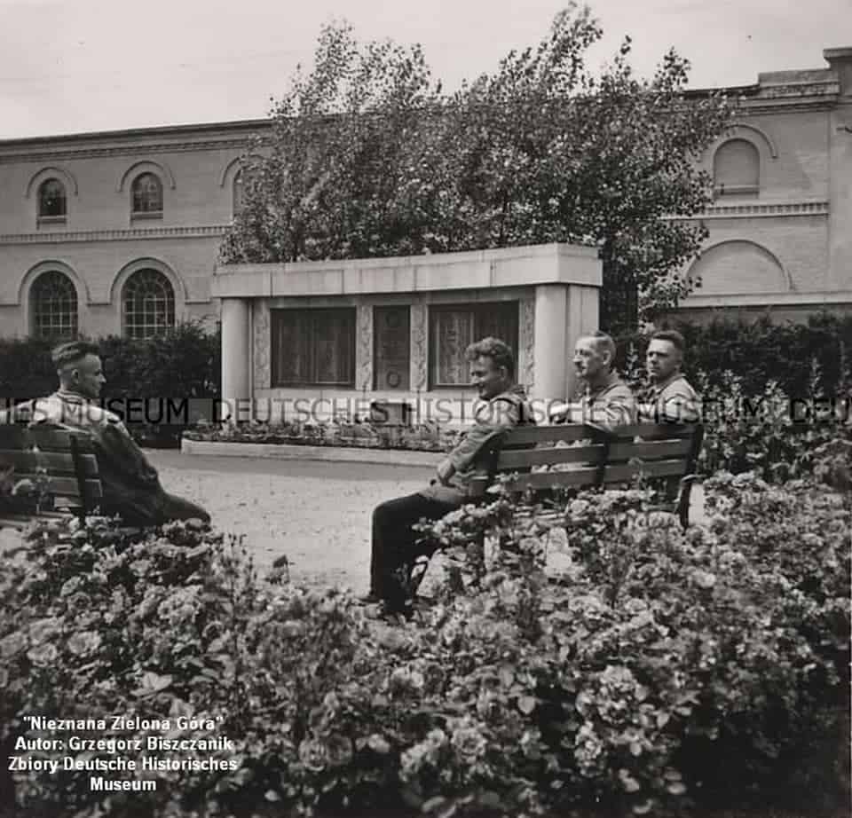 Wojna się zakończyła i miasto powoli otrząsało się z wojennego kurzu. Deutsche Wollwaren Manufaktur AG zaczęło wracać na swoje prawidłowe produkcyjne tory. Nie zapomniano jednak o poległych pracownikach. Dlatego też, na jednej z działek wytyczono zarys miejsca, gdzie miał znaleźć się obelisk przypominający o zabitych wraz z miejscem na odpoczynek. Pomnik miał być ulokowany w centralnym miejscu i otoczony murem w kształcie połowy okręgu. Na nim miały znajdować się trzy tablice z nazwiskami.