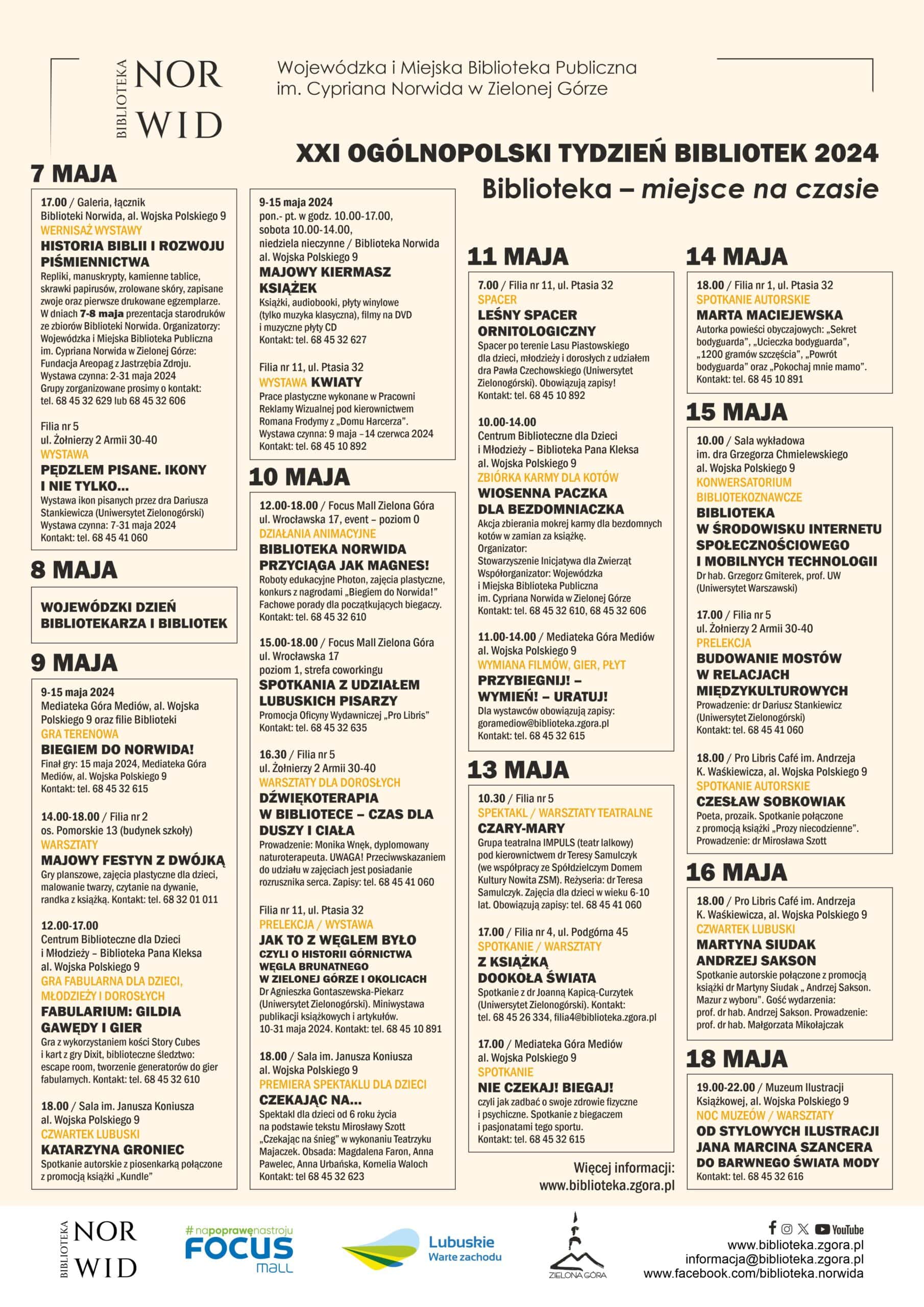Szczegółowy harmonogram wydarzeń prezentujemy poniżej. Tydzień Bibliotek rozpocznie się 7 maja i potrwa do 18 maja.