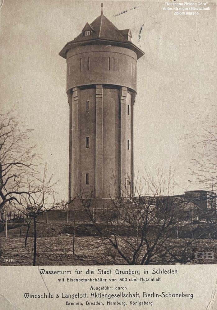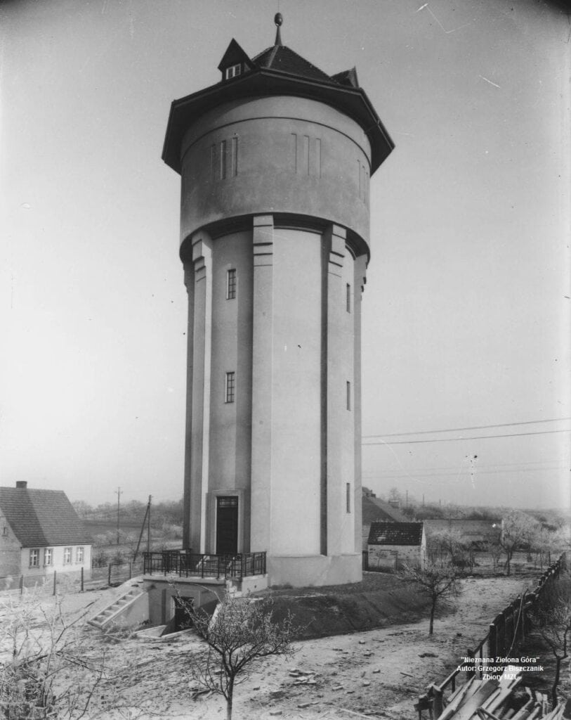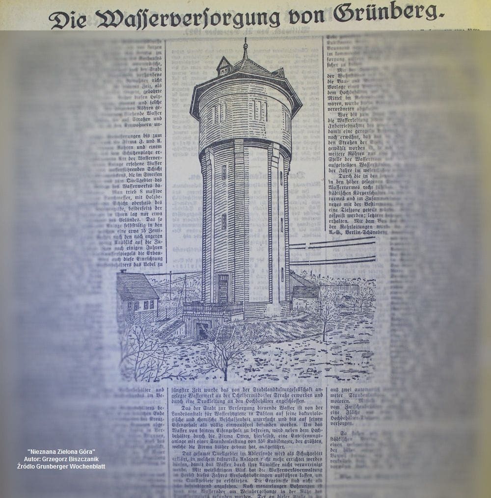 Pod koniec XIX w. tereny dzisiejszej ul. Kordiana, to rozległe łąki i winnice. Niczym nie przypominały dzisiejszego osiedla. Daleko od centrum i wszelkiej zabudowy, a pojedyncze domu można było policzyć na palcach jednej ręki. Niemniej jednak były to jedne z najwyżej położonych terenów w mieście. Przy ul. Nowej w niedalekiej odległości od Dłubni Wschodniej (tak, to kolejna rzeka w Naszym mieście) powstał, jak na tamtejsze czasy, ogromny kompleks wodociągowy, który miał pokryć zapotrzebowanie miasta w wodę. W 1897 r. wybudowano betonowy zbiornik ciśnieniowy na wodę o pojemności aż 1.000 m3. Popyt na wodę w rozwijającym się Grünbergu jednak wzrastał. Wystąpiły jednak problemy z dostarczaniem wody do lokali mieszkalnych położonych na piętrach kamienic. Aby uniknąć temu nagłemu problemowy postanowiono działać. Wodociągi rozbudowywano oraz unowocześniano. W 1926 r. władze komunalne podjęły decyzję o budowie „zbiornika wieżowego”. Opracowania budowlane i projekty zlecono jednemu z lepszych niemieckich biur „Windschild & Langelott” z Berlina. Nie ociągali się oni z pracą zdobywając wszelkie pozwolenia oraz opomiarowania. Prace budowlane prowadziły już miejscowe firmy. Zaledwie rok później wieża była gotowa. Jej wymiary, to 33,5 m. wysokości oraz prawie 9 m szerokości. Wyposażona była w dwa zbiorniki na wodę – górny o poj. 300 m3 oraz dolny (tzw. przelotowy) o poj. 175 m3.