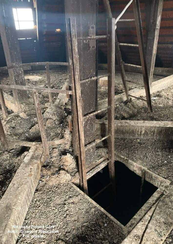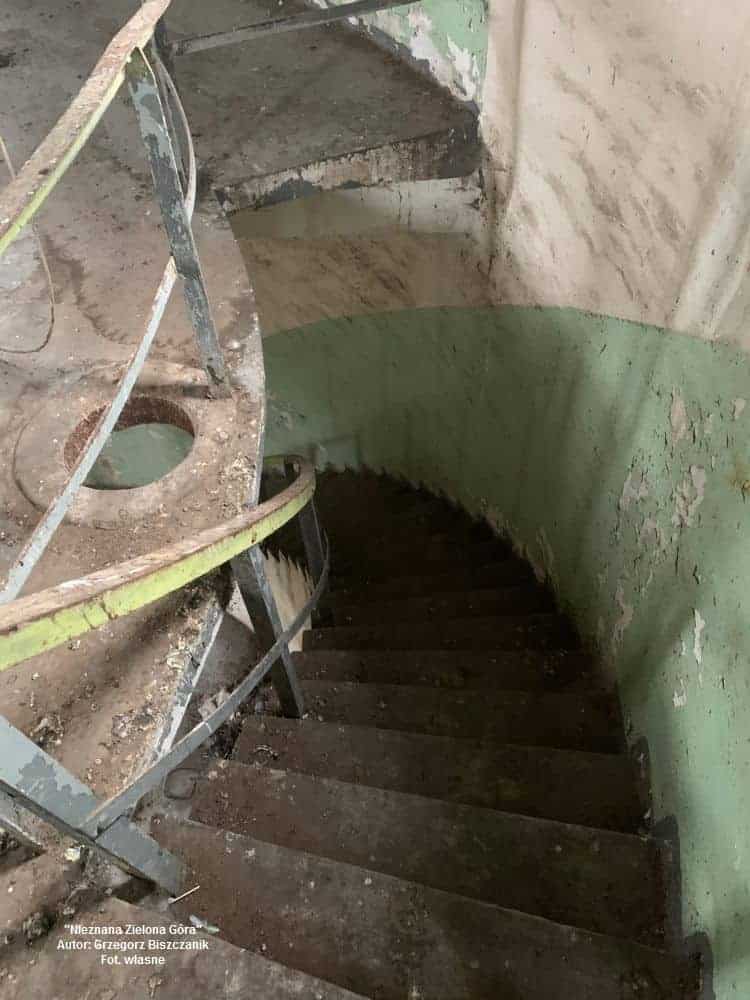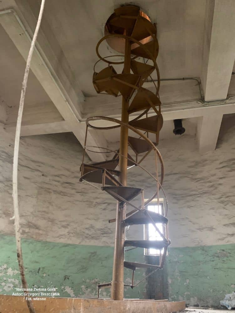 Otwarte wrota wieży ukazują ogromną i pustą przestrzeń oraz niewielkie kręte schody, którymi można wejść wyżej. Z każdą kondygnacją się one zwężają aż dochodzimy do pionowej drabiny. Trzeba wciągnąć brzuch i poczuć się niczym w tunelu treserskim dla psów, bo wchodzimy do dawnego zbiornika na wodę! Będąc na górze nie sposób nie zauważyć ogromy gołębich „kup”, tworzących kloaczny dywan. Nie szczędząc butów można je odgarnąć oraz zobaczyć kilka przedwojennych studzienek grünberskiej spółki “Wasserversorgung A.G.”. To już jest wielki ewenement na skalę miasta! Z wieży rozpościera się widok na cztery strony świata przez niewielkie okienka.