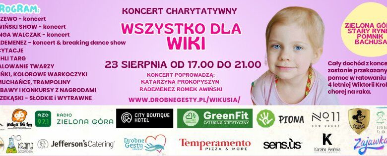 23. sierpnia od 17.00 do 21.00 przy pomniku Bachusa w Zielonej Górze koncert charytatywny. Pomagamy Wiktori Krokos, 4- letniej zielonogórzance, która zmaga się z nowotworem – neuroblastoma IV stopnia z przerzutami do kości i szpiku.