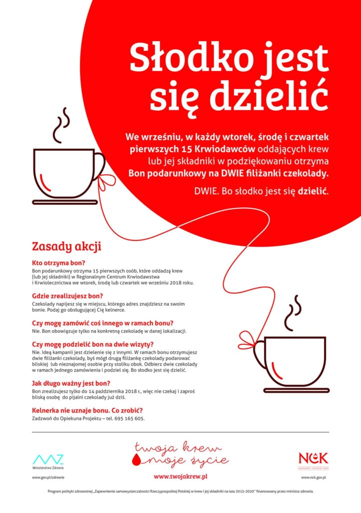 Z wakacji powrócili także uczniowie, którzy mogą oddać krew. RCKiK namawia więc szkoły, aby organizowały u siebie akcje krwiodawcze. Oprócz tego wystartowała akcja „Słodko jest się dzielić”.