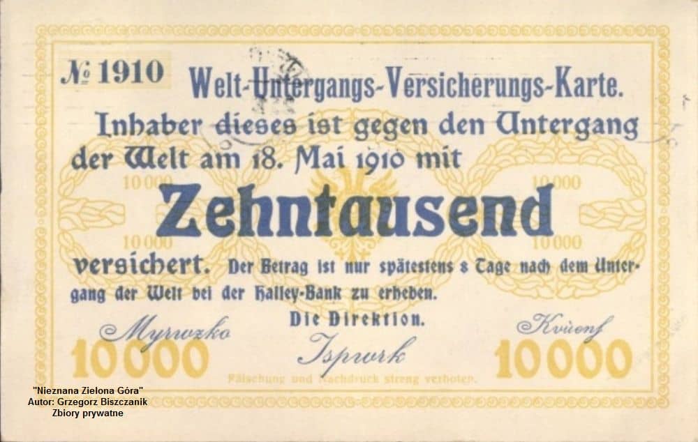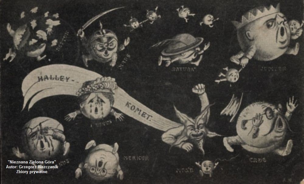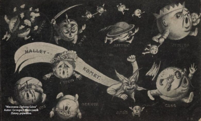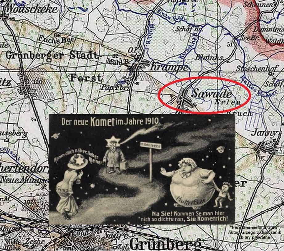 Mieszkańcy cichej i spokojnej ówczesnej podzielonogórskiej wsi (wówczas nazywała się Sawade) wiedli uporządkowane i bogobojne życie. Od początku kwietnia 1910 r. docierały fantastyczne i całkowicie niepoparte nauką informacje, że pojawienie się na niebie komety zwiastować będzie tragiczne w skutkach komplikacje. W tamtych czasach ludzie wg wierzeń wyznaczali z ruchu komet datę ziemskiej zagłady. W tym roku nad zielonogórskim niebem miała pojawić się… kometa Halleya.