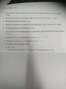 Marcin Pabierowski natomiast zamierza nadal wspierać sportowców, popracować przy zielonogórskich drogach i chodnikach oraz wesprzeć m.in. Aeroklub Ziemi Lubuskiej. Ponadto planuje zakup psów patrolowo-tropiących dla zielonogórskiej policji.