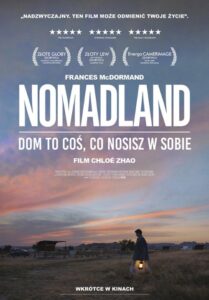 “Nomadland”– nagrodzony trzema Oscarami za rok 2020 i początek 2021(najlepszy film, reżyserka i aktorka pierwszoplanowa) jest pozycją obowiązkową dla kinomanów. Fern ( Frances McDormand) jest kobietą “po przejściach”. W czasie kryzysu ekonomicznego traci pracę, a jej mąż umiera. Gdy traci dom postanawia mieszkać w vanie, którym jeździ w poszukiwaniu pracy. W trakcie swych podróży poznaje wielu innych amerykańskich „nomadów”. Scenariusz do filmu powstał na podstawie książki “Nomadland” Jessici Bruder. Zarówno w książce i filmie pojawiają się autentyczni, z krwi i kości wędrowcy/pionierzy – Linda May, Swankie, Gay DeForest.